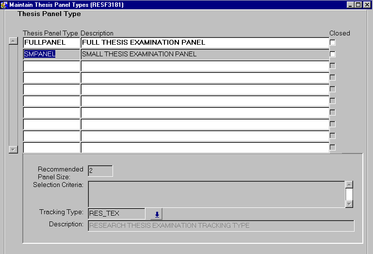 Use this form to record the Thesis Panel Types appropriate to the institution. A Description must be entered. Recommended Panel Size and Selection Criteria can be defined, but are not mandatory. A Tracking Type can be assigned to a Thesis Panel Type using this form. (Institution-defined Tracking Types must be created using the form TRKF1100 before they can be assigned to a Thesis Panel Type here. Only Tracking Types that map to the system tracking type 'RES_TEX' can be used). |