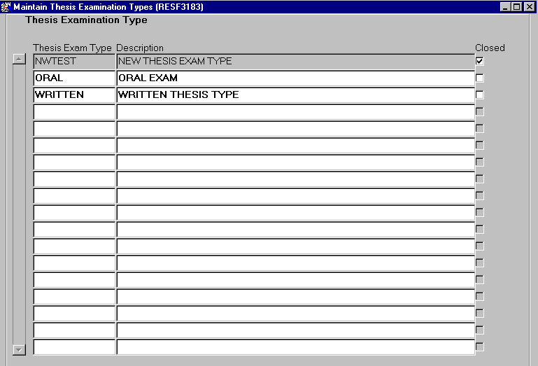 Use this form to record the institution-defined set of Thesis Examination types. Thesis Exam Type and Description are mandatory entries. Once created, the Thesis Exam Type entry cannot be modified. Modifications can be made to the Description. |