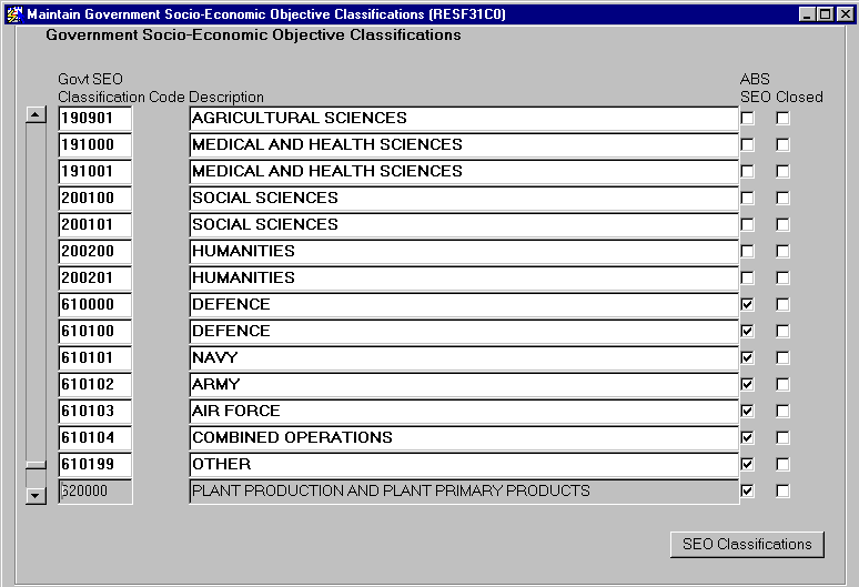 Use this form to enter and maintain the DEST and ABS SEO Classifications. Each classification code must be unique. The ABS SEO indicator is used to distinguish between the DEST and the ABS schemes. The SEO Classifications button can be used to navigate to form RESF31D0 for the purpose of: