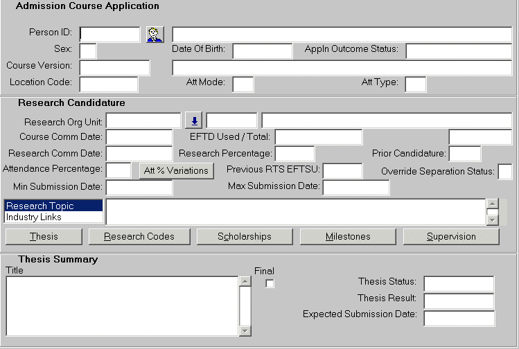 Accessing This Form From Admissions: When a person applies for admission to a course where the Course Type has the Research Type indicator set (maintained in form CRSF1110), this form would be accessed from ADMF3000, using the Candidature button. This button will only be available on ADMF3000 if the research step exists as part of the admission process category. (Refer to Admissions documentation for an explanation of process categories.) The Application Outcome Status will be 'PENDING' where the student has not yet been made an offer. Candidature (and Thesis, see below) details can be entered at this stage, but are not mandatory. When an offer is to be made to an applicant (i.e. their Application Outcome Status is to change to 'COND-OFFER/PENDING' or 'OFFER/PENDING'), some candidature fields are mandatory.
