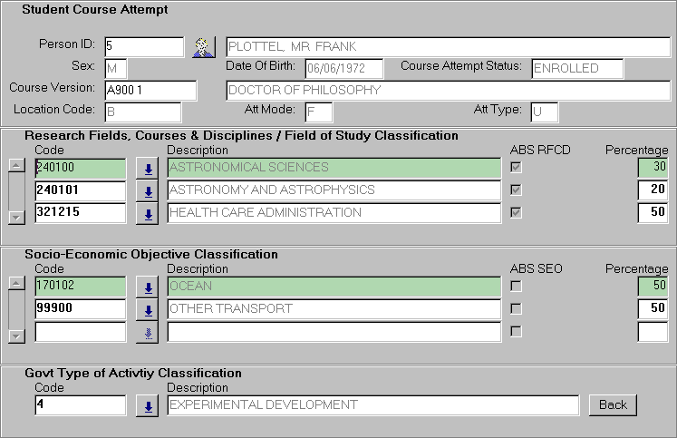 Use this overlay to enter the three categories of research codes, applicable to this candidature. RFCD/FOS/ FORC and SEO Classifications: In these 2 blocks, select valid institution-defined codes, applicable to the candidature. These codes are mapped to Government codes from one of three coding schemes in current use (DEST or the Australian Bureau of Statistics). A checkbox indicates the use of an ABS code. Multiple RFCD/FOS/FORC or SEO Classification codes can be entered, if applicable. In the RFCD/FOS Block the total of the percentages for research codes (ABS RFCD indicator selected) must be 100. Similarly, the total of the percentages for non-research codes (ABS RFCD indicator not selected) must also be 100. Government Type of Activity Classification Code requires the entry of a single code only. The LOV for each code displays only active codes (not historical Closed codes). |