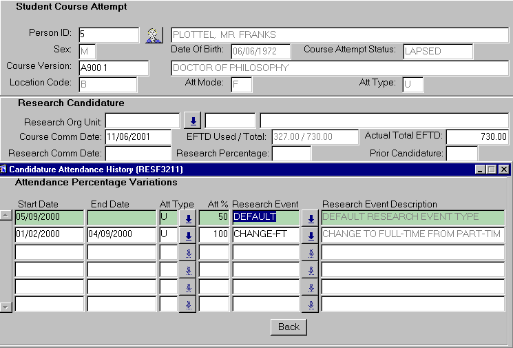 The Attendance Percentage field displays the attendance percentage effective at the current date. Attendance percentages are maintained by selecting the ATT % Variations button and entering records in the Attendance Percentage Variations Overlay. The causes of variation in attendance must be recorded as Events. The Previous RTS EFTSU field is used to record, for DEST reporting purposes, Research Training Scheme EFTSU previously undertaken at another university.