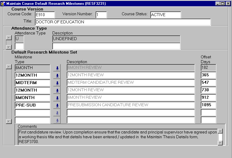 Milestones are used in the Research subsystem, to mark the progress of a Candidature. A standard set of milestones can be created for a Course Version, using this form. This set of Course Default Milestones can then be used when establishing milestones for an individual candidature (using the Maintain Candidature Milestones form RESF3232). |