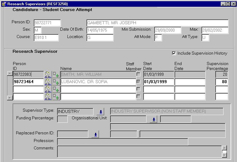 Any research candidate will have one or more supervisors, over the period of their candidature. This form enables the recording of information about the supervision of this candidature and is accessed from the Candidature form (RESF3211), using the Supervision navigation button.