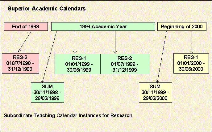 Note: It may be appropriate to offset the research start date alias instances from the admission calendar course start date alias instances. For the RES-1 (01/01/1999 - 30/06/1999) calendar in the example above, 'RES-STRT' could be offset from the course start date alias for the subordinate admission period calendar instance by 0 days.
