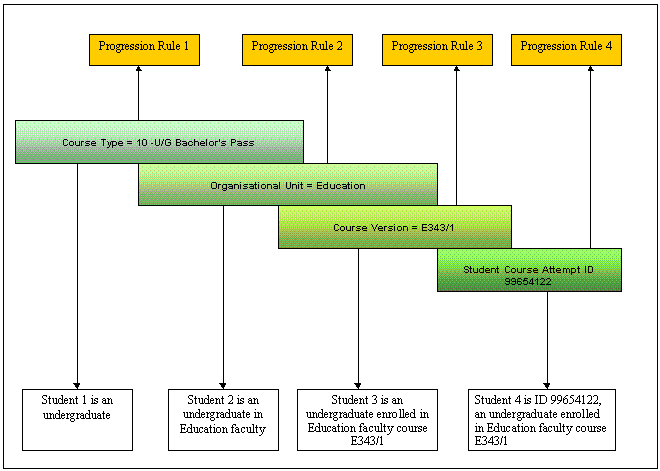 Where a Progression Rule Category contains a number of rules, the element to which each is linked, determines which of the rules is applied to a student.