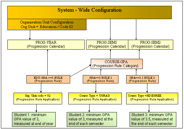 A complete Progression Rule Application is one where a progression rule is linked to a system element, at least one progression calendar and at least one progression outcome. The processes of applying progression rules and outcomes to a student are controlled by this link between the rule, a progression calendar, a system element and a progression outcome.