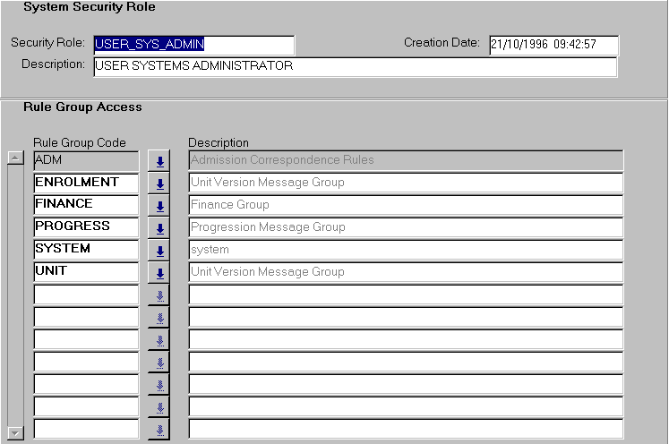 Rule Group Access Block: Rule group codes available to persons with the Context Security Role may be selected using the Rule Group Code list of values. Rule types currently available are: ADM (admission correspondence rules), FINANCE (disbursement and fee assessment rules ), PROGRESS (progression message rules), ENROLMENT (Sys-wide and Unit message rules) and SYSTEM (Translation control). |