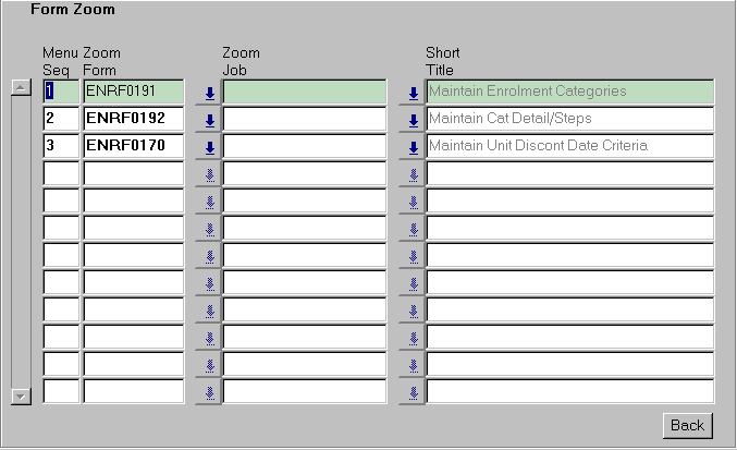 When using the Record Enrolments form (ENRF3000) it could be useful to be able to navigate quickly to the Maintain Person Encumbrance Details form (ENRF6310). By recording ENRF6310 against ENRF3000, in the Form Zoom block, a person using ENRF3000 can select ENRF6310 under the Zoom menu bar option to immediately display the Person Encumbrance form. |
