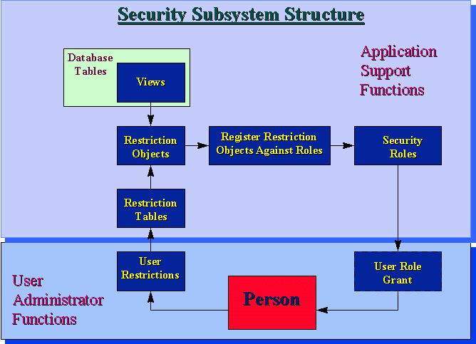 This diagram illustrates how the various components of the security subsystem interact to create an individual's security profile.