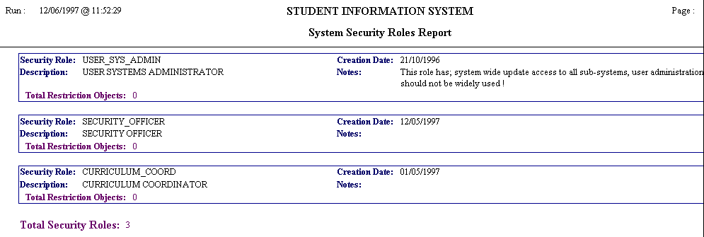 This report provides a list of all selected system security roles and details of those roles, and details of any privileges on views assigned to roles. |