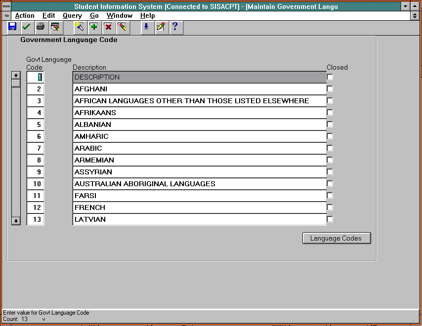 This form is used to record and maintain the set of government language codes. Universities are required to report to government, for each student, the main non-English language spoken at the student's permanent home residence. The codes for reporting this data are specified in the DEST manual (element348). Where a set of institution defined language codes has been defined (ENRF0130), each must be mapped to a particular Government Language Code. |