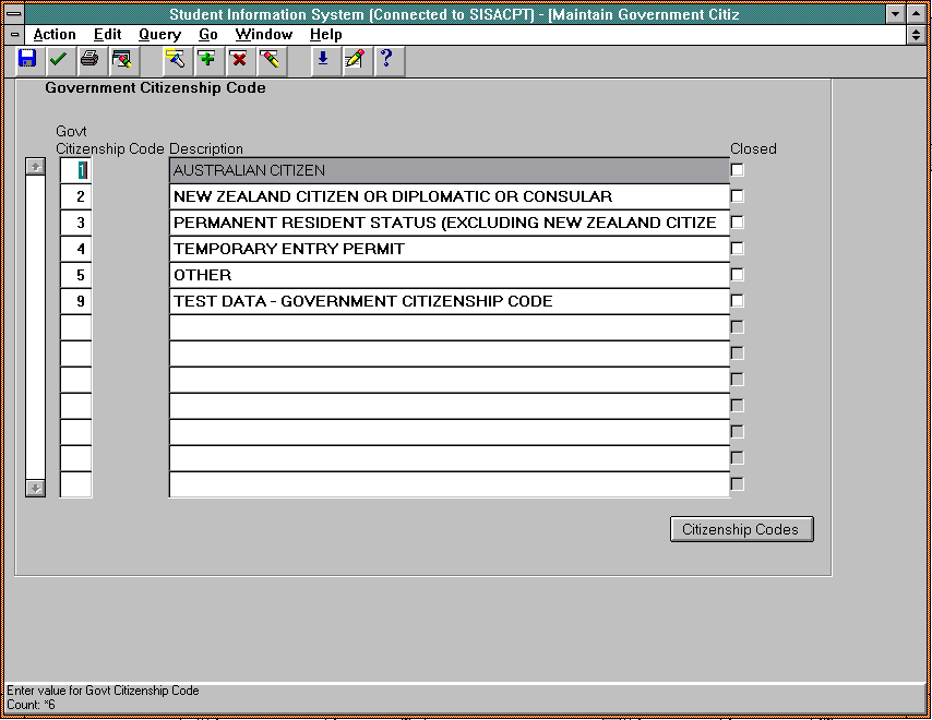This form is used to record and maintain the set of government citizenship codes. Universities are required to report to government each student's status in relation to Australian citizenship. The codes for reporting this data are DEST manual (specified in the element 358). Where a set of institution defined citizenship codes has been defined (ENRF0140), each must be mapped to a particular Government Citizenship Code. |
