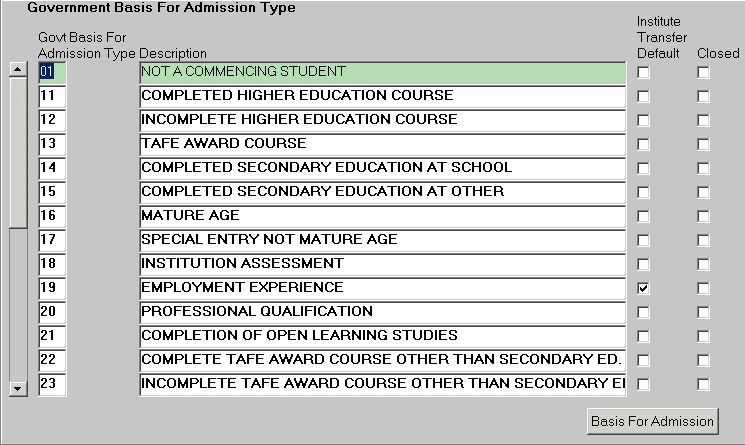 Use this form to record 'government basis for admission type codes' (DEST element 327). When a set of institution defined basis for admission type codes are recorded in ADMF0270, each must be mapped to one of these government types. Institution codes can be the same as government codes. The tick box 'Institute Transfer Default', is used to determine which Government Basis For Admission code should be used to assign to the course if Basis For Admission code is not specified. |