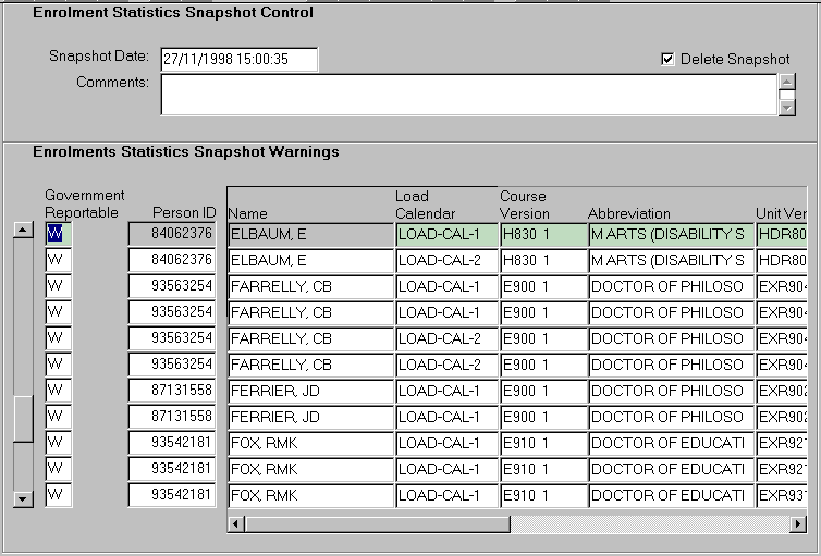 Use this form to view enrolment statistics snapshot records with a Government Reportable Indicator of 'W - warning', and (following investigation) to reset the flag to 'X - not reportable' where appropriate. Execute a query to locate the required Enrolment Statistics Snapshot. All warning records are displayed for the snapshot. Where appropriate, re-set the Government Reportable indicator to 'X'. |