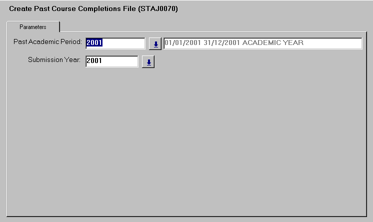 The Past Academic Period parameter is used to specify the previous academic period. The course completion cutoff date assigned to this calendar is used to determine which completed student course attempts to include in the extract file. The Submission Year parameter is used to determine which of each student's person statistics records (prior to the submission year) should be used as the source of statistical data extracted by this job. |