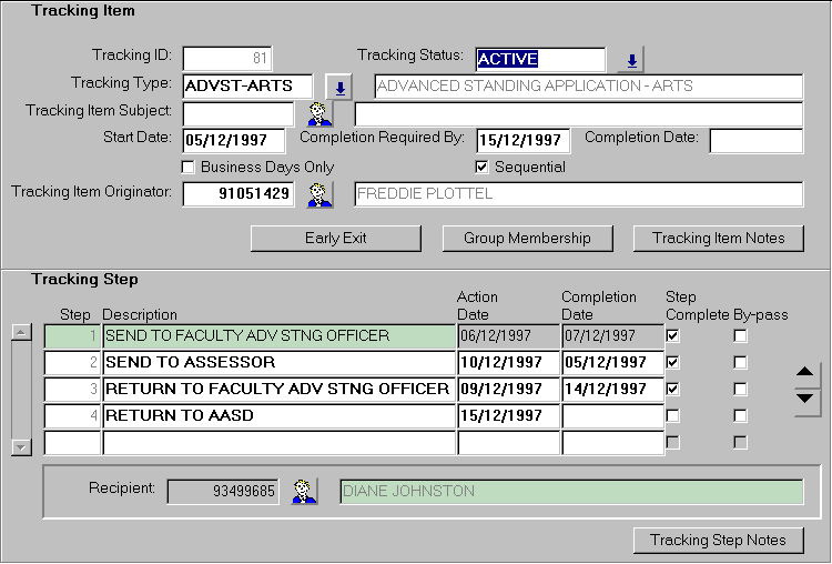 A default set of steps may exist for the tracking type selected, and these default steps will be displayed when this block is entered. Further steps can be added, or steps deleted, in this block. If recipients have not been recorded for any default step, the system enters the originator of the item as recipient. If no steps have been recorded against the type, all steps must be created in this block, including the action dates and recipients for each. Only the originator of an item can create, add or delete steps. Further information about tracking steps can be found in the introductory section under: Recording progress instructions are given in a separate section below. |