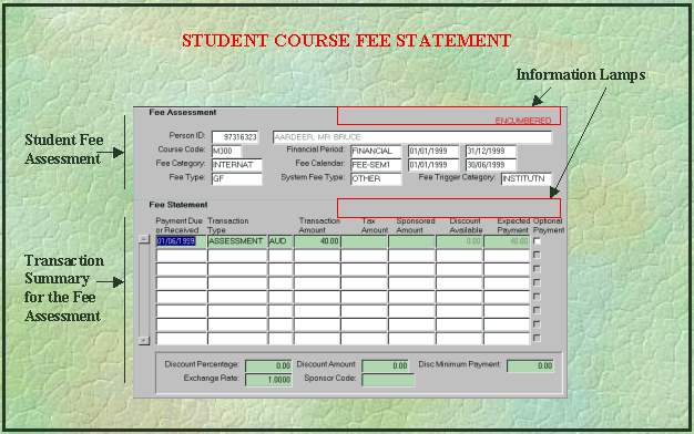 - Fee Statement - displays all recorded transactions for the context