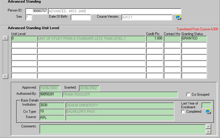 - Unit Level - the unit level at which advanced standing has been approved/granted.