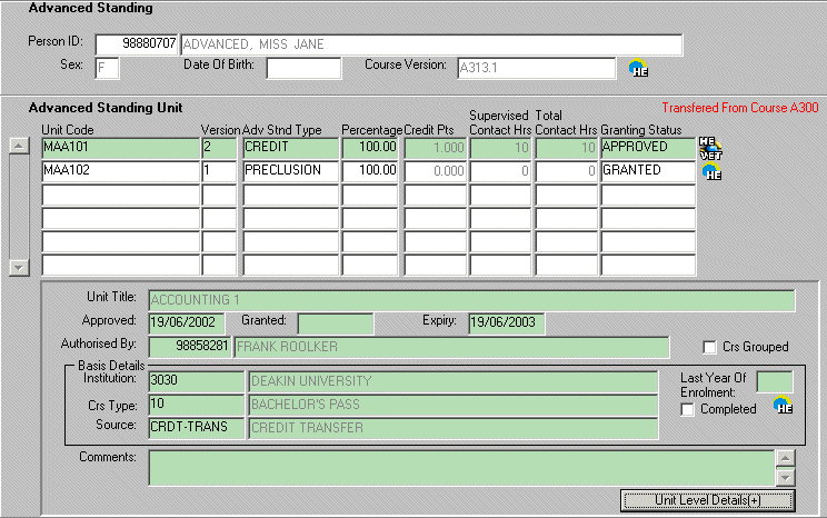 advanced standing record causes the Alternate Unit button to display.