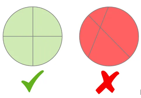 You can only have a fraction with equal parts. See the picture below. The circle on the left is divided into 4 equal sections. So, if we wanted 1 part of this circle, it would be ¼. However, the circle on the right is not in equal parts, so we cannot say one section is ¼.