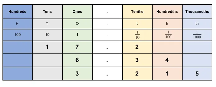 Rows 4 - 6: these rows have examples of how we place decimal numbers into the chart.